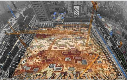 (濟南恒隆廣場基坑,深12m,周長980m, 基坑安全等級一級,位于泉水的中心地帶,采取綜合措施,達到了降水施工和保泉的雙重目的,支護采用的支護樁與平撐和斜撐組合的形式在濟南市也是首次引進采用)