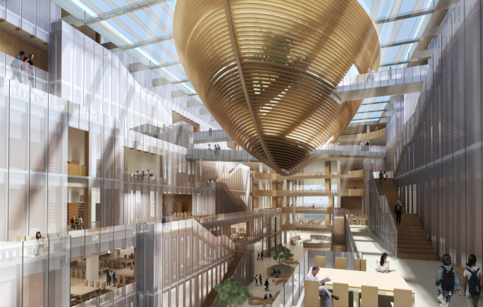 中國海洋大學(xué)西海岸校區(qū)圖書館,是騰遠(yuǎn)2020年的創(chuàng)意之作。中庭七層頂部42米跨的鋼屋蓋,設(shè)有梭型鋼結(jié)構(gòu)“漂浮的船屋”,這個揚(yáng)帆起航的震撼造型,如果沒有結(jié)構(gòu)設(shè)計(jì)師的幫助,最終只能成為空中樓閣,難以落地。但,孫紹東團(tuán)隊(duì)就是問題的終結(jié)者,驚喜的創(chuàng)造者。