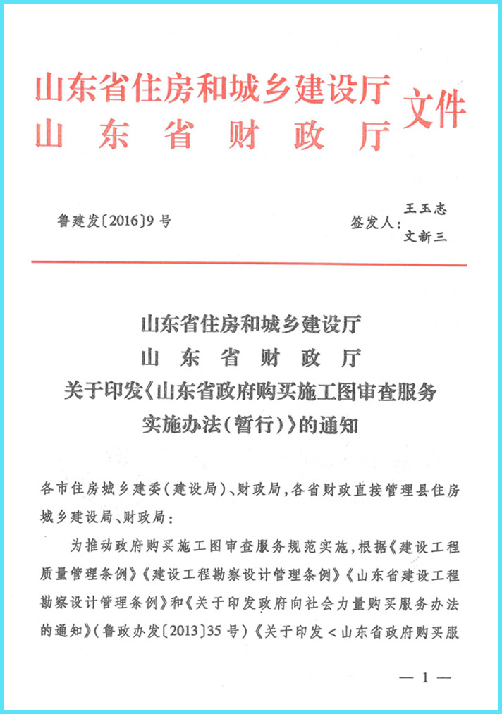 山東省住房和城鄉(xiāng)建設(shè)廳 山東省財政廳關(guān)于印發(fā)《山東省政府購買施工圖審查服務(wù)實施辦法(暫行)》的通知