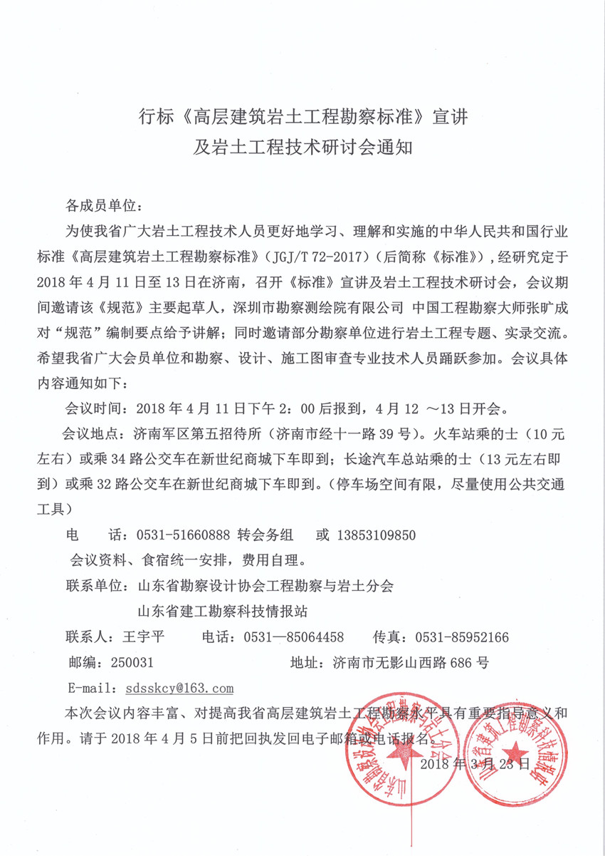 本次會議內(nèi)容豐富、對提高我省高層建筑巖土工程勘察水平具有重要指導意義和作用。請于2018年4月5日前把回執(zhí)發(fā)回電子郵箱或電話報名。