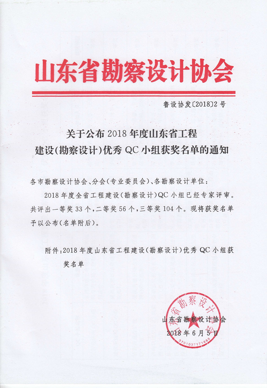 關于公布2018年度山東省工程建設(勘察設計)優(yōu)秀QC小組獲獎名單的通知