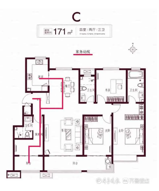家務(wù)動(dòng)線顧名思義,是指在家務(wù)勞動(dòng)中形成的移動(dòng)路線,主要包括做飯、洗衣服、晾衣服和打掃衛(wèi)生等。涉及的空間主要集中在廚房、衛(wèi)生間和陽(yáng)臺(tái)。家務(wù)動(dòng)線在三條動(dòng)線中用得最多,也最繁瑣,所以在買房的時(shí)候一定要注意順序的合理安排,避免動(dòng)線過(guò)于重復(fù),否則會(huì)讓家務(wù)勞動(dòng)的過(guò)程變得更辛苦。按照一般的做飯習(xí)慣,都是先去冰箱拿食材,然后清洗處理,最后在灶臺(tái)煎炒烹炸。食材的拿取、處理、烹飪就是廚房的三角動(dòng)線。只要你的廚房活動(dòng)是在三角動(dòng)線的三條邊上,就能保證不會(huì)來(lái)回反復(fù)的拿取清理東西,也就保證了廚房動(dòng)線的合理性。此戶型還設(shè)有保姆間并配有獨(dú)立衛(wèi)生間,將家政人員活動(dòng)區(qū)域與主人活動(dòng)區(qū)域分隔開,最大限度避免了對(duì)居住區(qū)的影響。