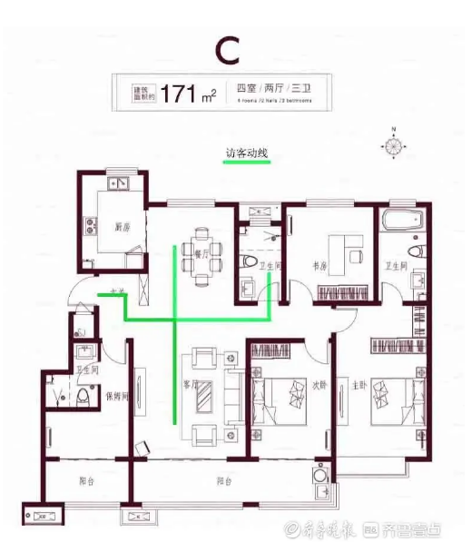 訪客動(dòng)線就是客人來(lái)訪會(huì)涉及的路線,主要包括客廳、餐廳和衛(wèi)生間等公共區(qū)域。與居住動(dòng)線的私密性和家務(wù)動(dòng)線的半私密性不一樣,訪客動(dòng)線屬于完全開放的空間,所以訪客動(dòng)線應(yīng)該盡量避免與之交叉,以免影響家人休息或工作。訪客動(dòng)線非常重要,會(huì)影響家里面的客人對(duì)自己家的印象,如果客人在客廳,就可以將臥室一覽無(wú)余,或者客人去到衛(wèi)生間要經(jīng)過(guò)主人房間等,無(wú)疑是非常不好的。合理的動(dòng)線會(huì)極大提高居住的舒適度,而不合理的動(dòng)線則會(huì)讓房間變得擁擠、雜亂,所以在購(gòu)買前了解戶型動(dòng)線非常重要。什么樣的戶型,就決定了你是怎樣的戶型動(dòng)線,如果戶型動(dòng)線不合理,或者很難讓你滿意,那么一定不要將就,除非把房子拆了,否則你可能今后都生活在這樣“不舒適”的空間里!