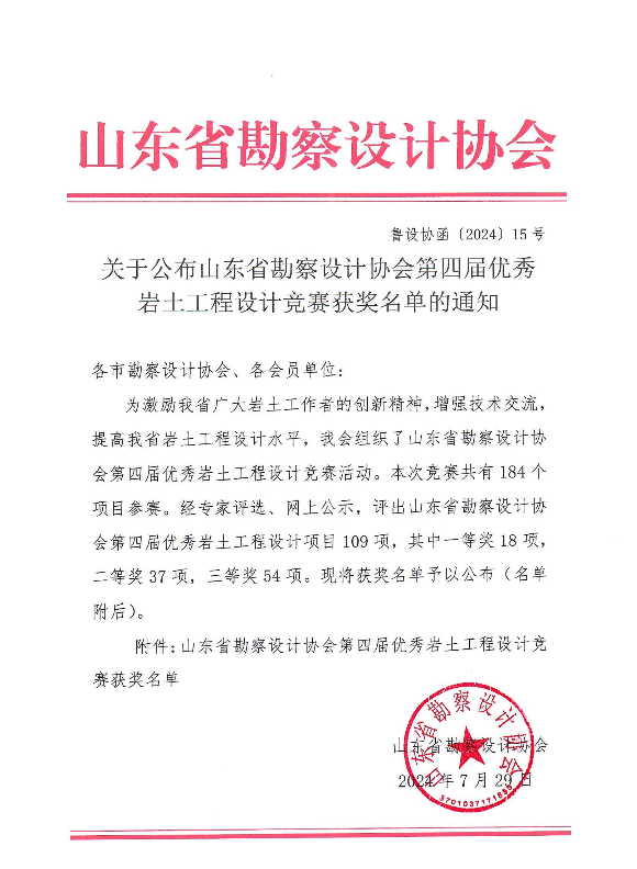 附件:關(guān)于公布山東省勘察設(shè)計協(xié)會第四屆優(yōu)秀巖土工程設(shè)計競賽獲獎名單的通知